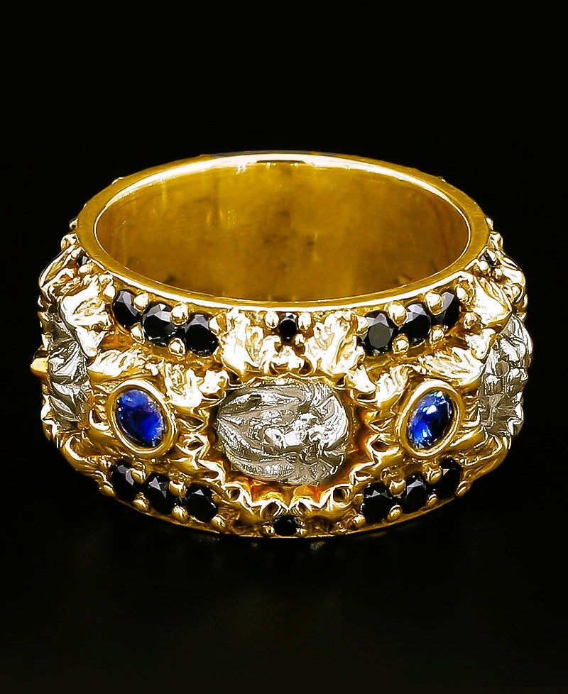 The ring is adorned with five intricate lions that evoke a sense of power and majesty, while the natural black diamonds and blue sapphire add a touch of luxury and sophistication to the overall look.