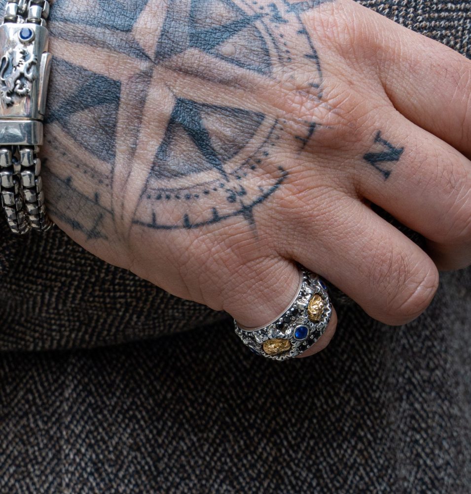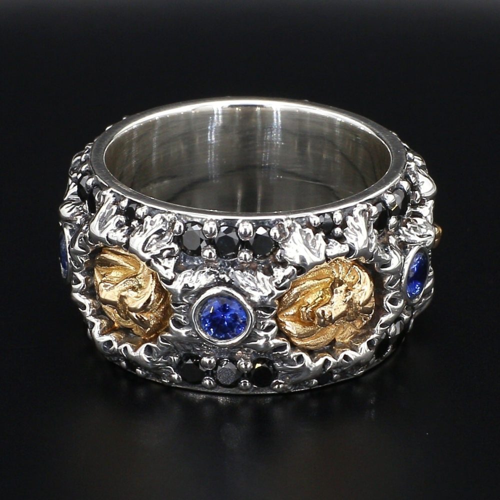 The ring is adorned with five intricate lions that evoke a sense of power and majesty, while the natural black diamonds and blue sapphire add a touch of luxury and sophistication to the overall look.