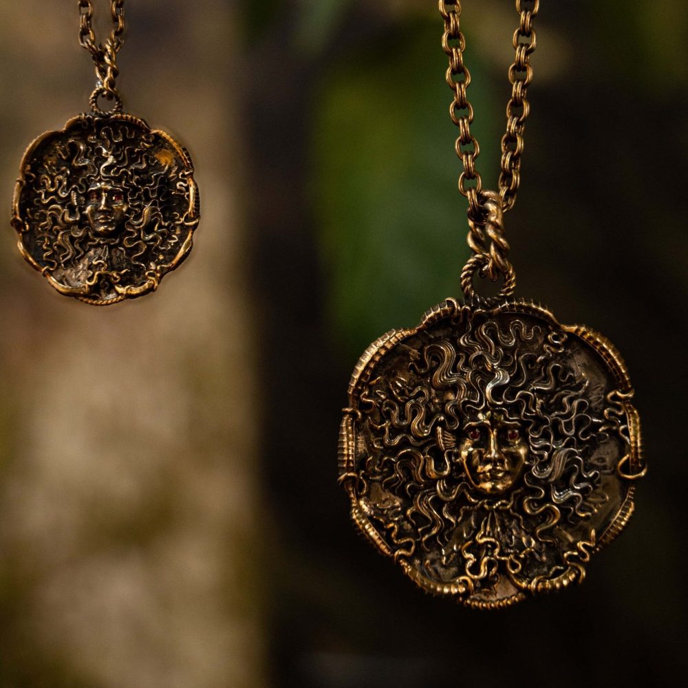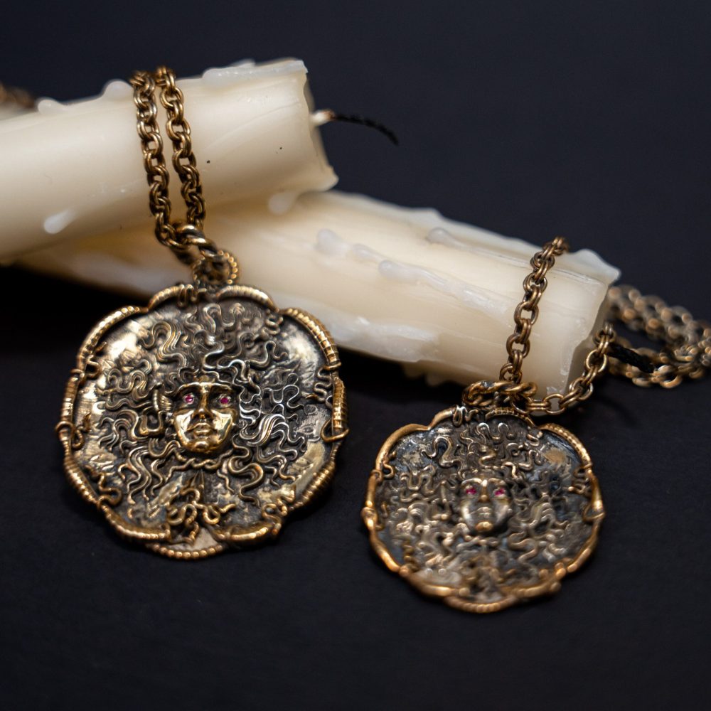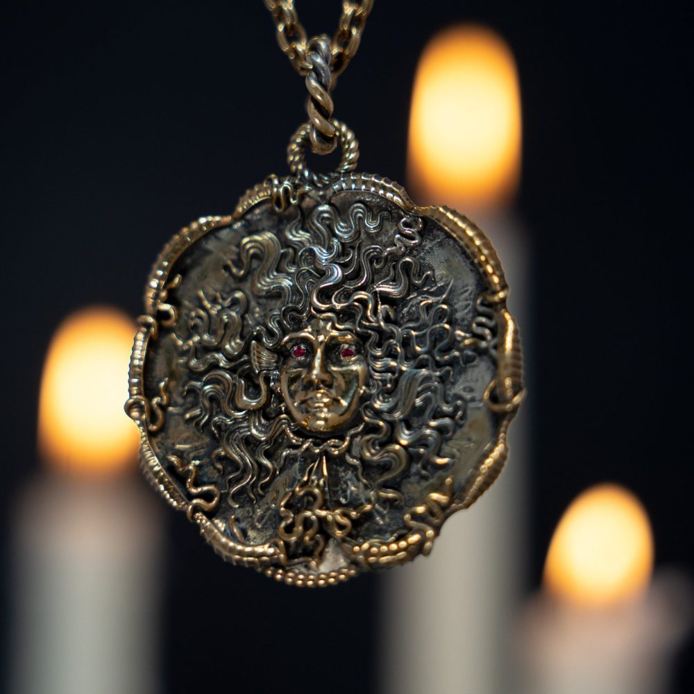 According to Hesiod , Medusa and her sisters were the sisters of the Graeae and lived “beyond framed Oceanus at the world’s hard edge by Night, where the clear-voiced Hesperides are” (Theogony, 270). The three sisters are often mentioned together, but it is Medusa who is commonly depicted in both ancient Greek literature and art. The name Gorgon comes from the ancient Greek word γοργός, meaning “grim,” “fierce,” and “terrible,” and Medusa’s name derives from the ancient Greek verb μέδω meaning “to guard” or “to protect,” which is very fitting given the apotropaic quality of the face of the Gorgon, known as the Gorgoneion.