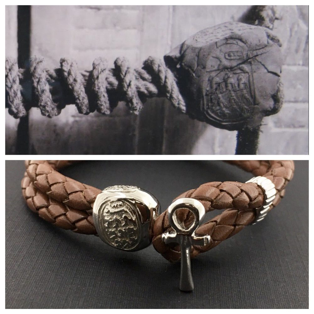 The unbroken seal on King Tutankhamun’s tomb, 1922The tomb of King Tutankhamen was secured by a rope and a seal. This seal stayed unbroken for 3,245 years. Designer Sal Knight who is known for his passion for jewelry making, historical art and Mythology was inspired by the seal that protected the Pharaoh. After months of sketching and carving, we are pleased to share with our work, which was created in the same manner fine jewelry are made, using the finest Lead-free metal ingredients and finest genuine leathers. Each piece is 100% handmade and one of a kind.